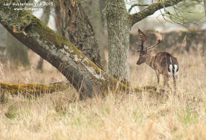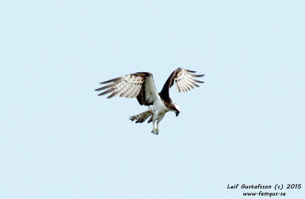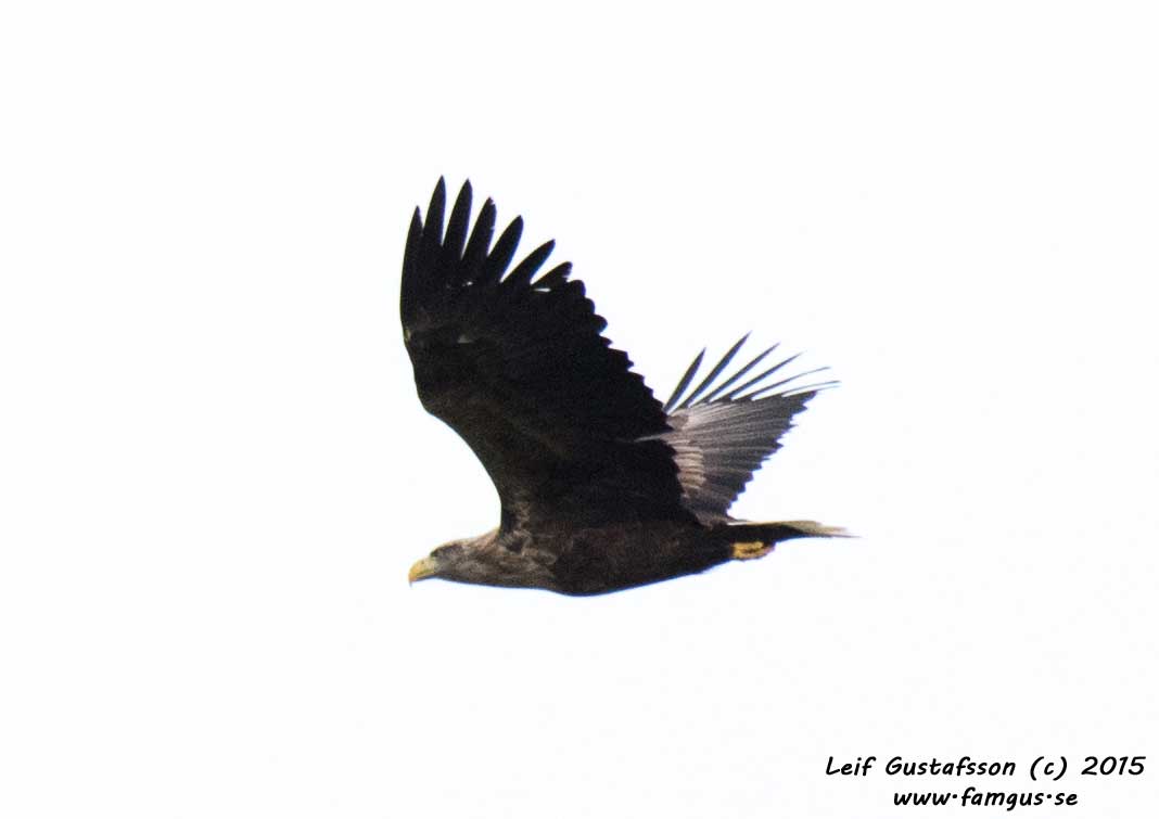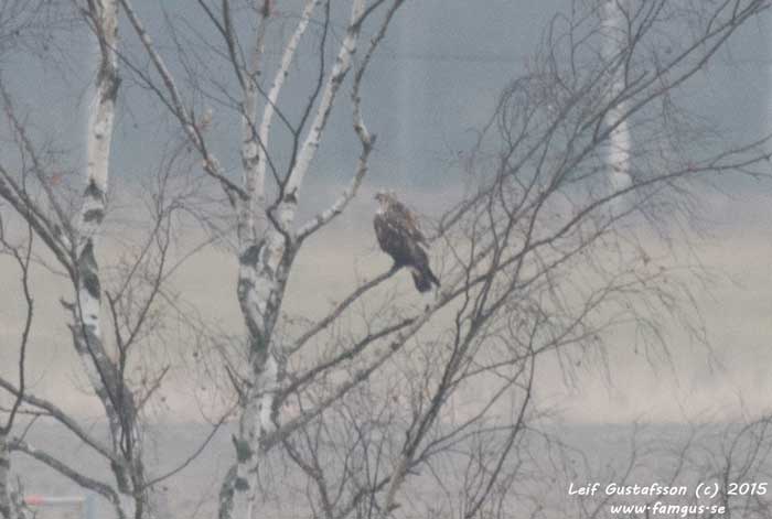 Efter någon timme fick jag sällskap av ett äldre par som också de kände väl till Fysingen. Medan vi stod där så fick vi syn på tre Havsörnen som starx över vattenytan flög med god fart på andra sidan sjön. Paret berättade att Havsörnen hade en boplats där någonstans som de inte använt på något år. Tydligen så finns ett havsörnspar som boar varje år, på lite olika ställen runt sjön, Vi fick sedan syn på en av de tre Havsörnarna sittande högt uppe i en björk. Igen på alldeles för långt håll för kameran.
