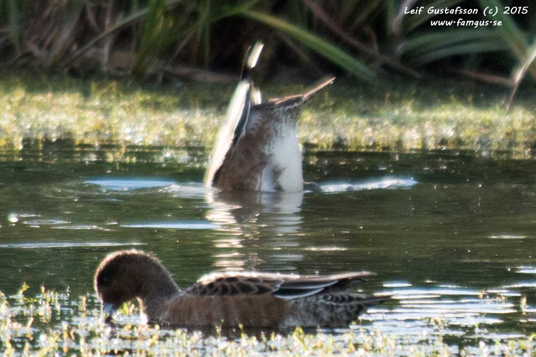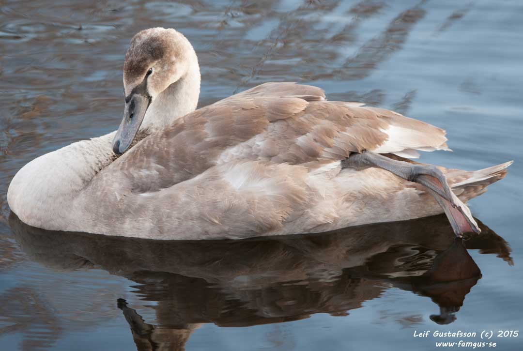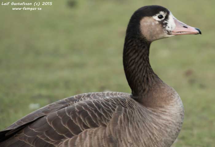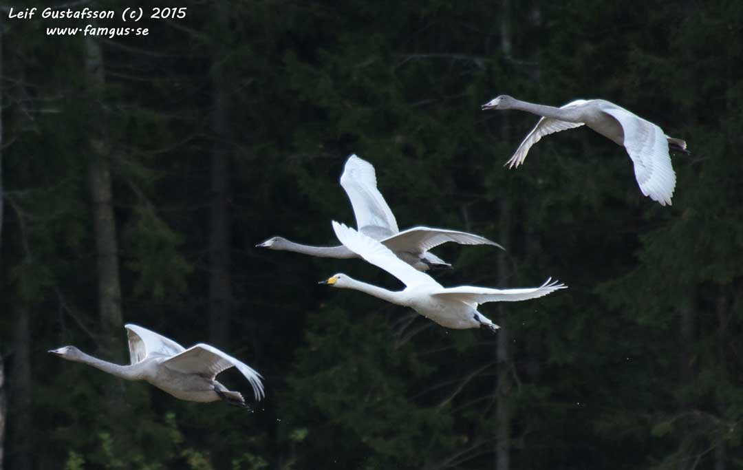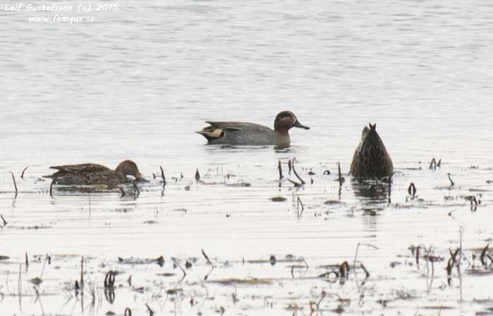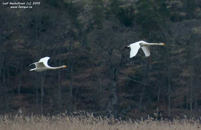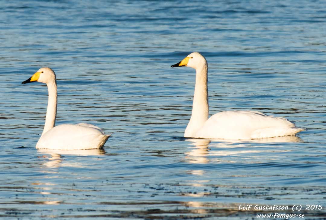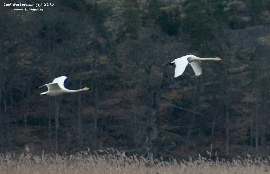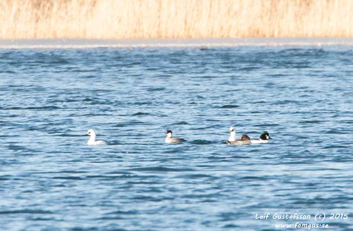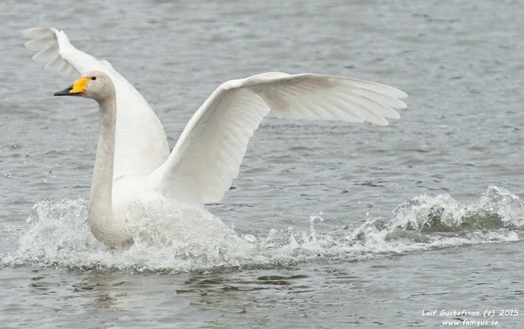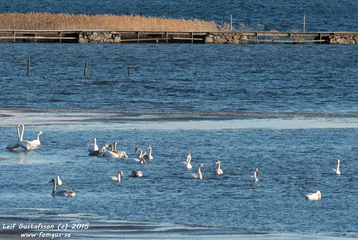 Ute på åkern gick en större flock av sångsvanar, både yngre och äldre. En ensam Grågås hade gjort dem sällskap. Vinden pinade så vi fortsatte ganska snabbt vidare mot fågeltornet. Där pinade vinden ännu mer så det var i stort sett omöjligt att se något därifrån. Ögonen tårades och tuben bara skakade i vinden. Det vi såg var två fiskare som i gummibyxor stod nästan upp till midjan i vattnet och kastade.