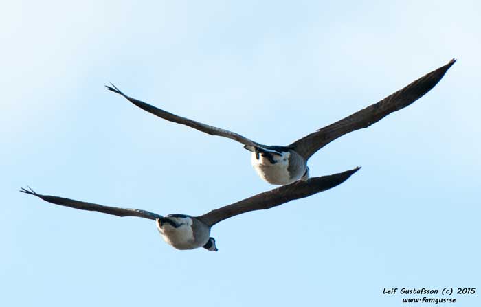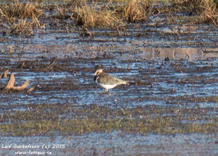 Vi tvärade sedan över ängarna till Hårbyparkeringen. Det var mycket blött så vi fick på vissa ställen riktigt hoppa på tuvorna för att komma framåt. På väg bort mot fågeltornet så hittade vi en plats i lä tillsammans med andra skådare bakom en staplad hög av vita platsinpackade höbalar. Där kunde vi studera gässen utan att tubkikaren vibrerade alltför mycket i vinden. Fem arter gäss kunde vi se: Bläsgås, Grågås, Sädgås, Kanadagås och Vitkindad gås. Spanade förgäves efter någon Spetsbergsgås. Lärkan drillade över våra huvuden, tofsvipor sågs fara fram och tillbaka och det var riktigt vårlikt.