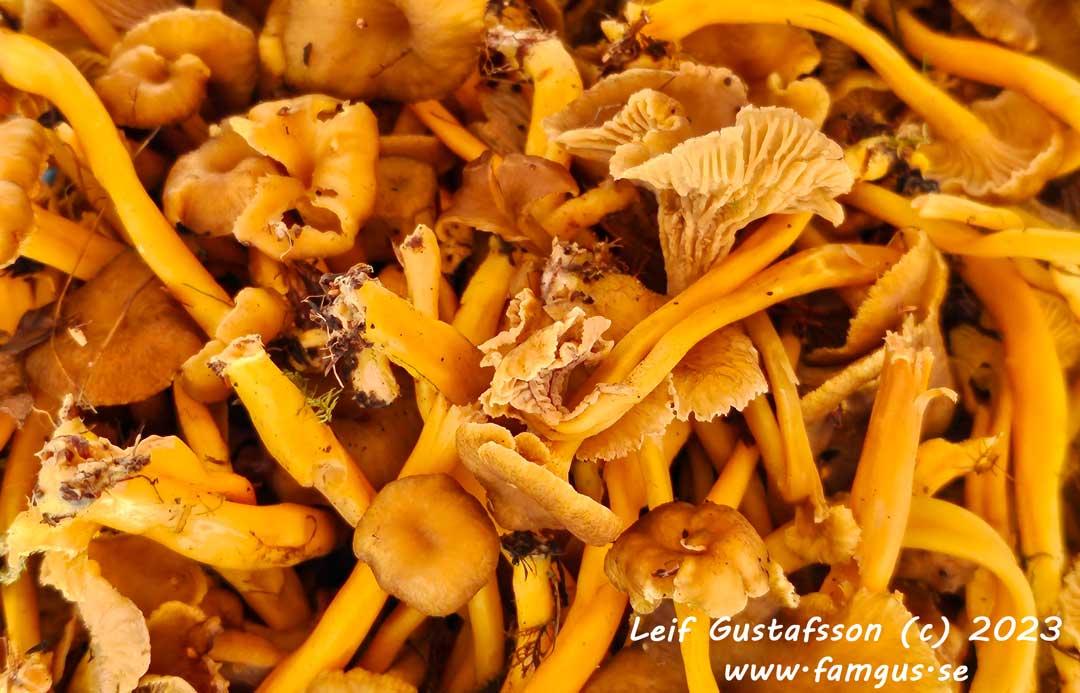 Barbro hade med sig en tom platspåse. Sagt och gjort, vi avvek från stigen och gick upp i skogen. Paret skojade inte, efter ett tag hade vi justerat blickan, svamp överallt. Vi plockade rakt ett par liter trattkantareller (eller möjligen rödgul trumpetsvamp).