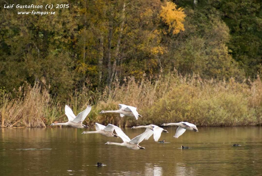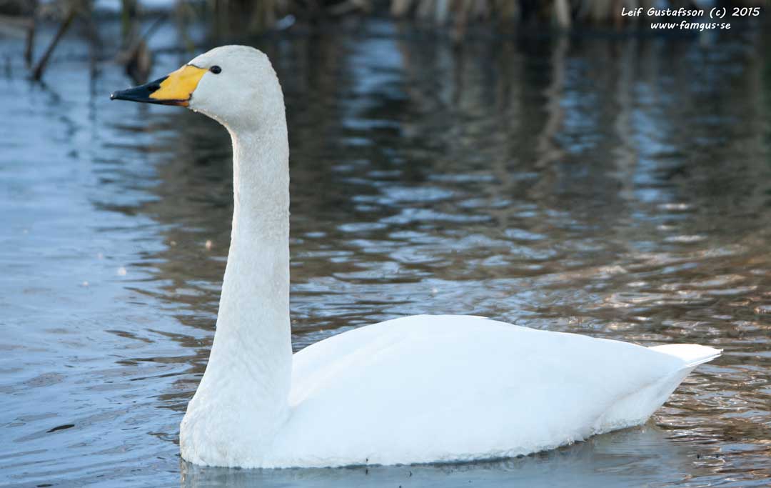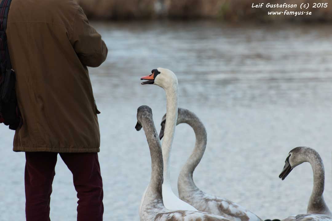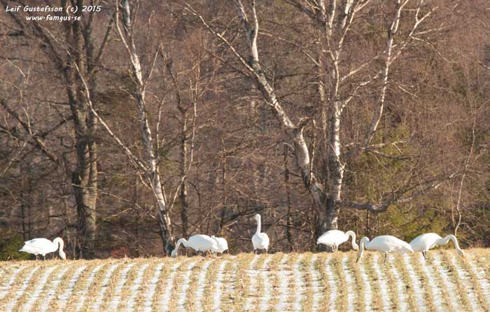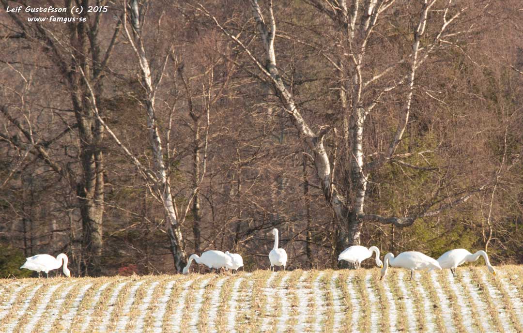 Ute på åkern gick en större flock av sångsvanar, både yngre och äldre. En ensam Grågås hade gjort dem sällskap. Vinden pinade så vi fortsatte ganska snabbt vidare mot fågeltornet. Där pinade vinden ännu mer så det var i stort sett omöjligt att se något därifrån. Ögonen tårades och tuben bara skakade i vinden. Det vi såg var två fiskare som i gummibyxor stod nästan upp till midjan i vattnet och kastade.