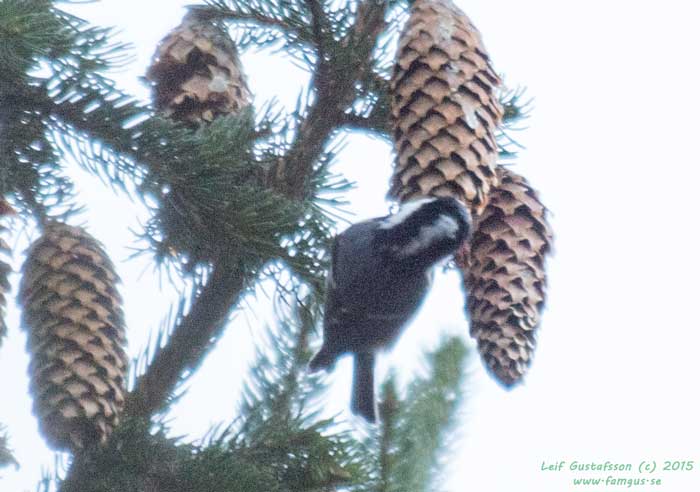 När jag kom tillbaka till parkeringen så hade "fågelskörden" varit så dålig att jag jag tog mig till fågelmatningen i hopp om något spännande. Och jag hade tur. I en hög gran precis bredvid matningen höll 4-5 mindre korsnäbbar till och kalasade på granfrön. Kottarna dunsade i backen med jämna mellanrum. Fick ett antal riktigt bra bilder. Medan jag stod där så kom det helt plötsligt en svartmes som hoppade omkring på backen och plockade rester från fågelbordet. Första gången jag lyckade fotografera den arten.