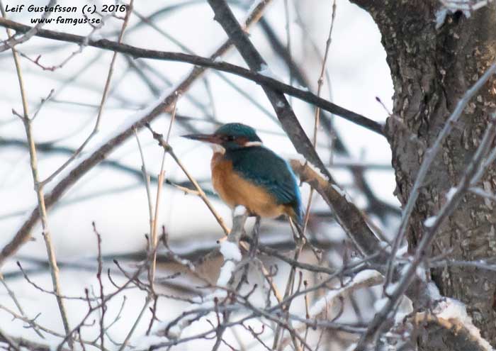 Tillbaka till ursprungsplatsen uppströms bron. Stod och huttrade när Kungsfiskare swichade förbi. Såg den som ett blått streck mellan trädstammarna och sedan var den borta. Efter en stund gick jag tillbaka till bron. Tur var väl det, för där hade samma skådare som sist fått syn på Kungsfiskaren igen. Nu såg vi den bättre, fortfarande på avstånd men klart bättre än sist. Vi fick se hur den fångade två fiskare innan den försvann igen.