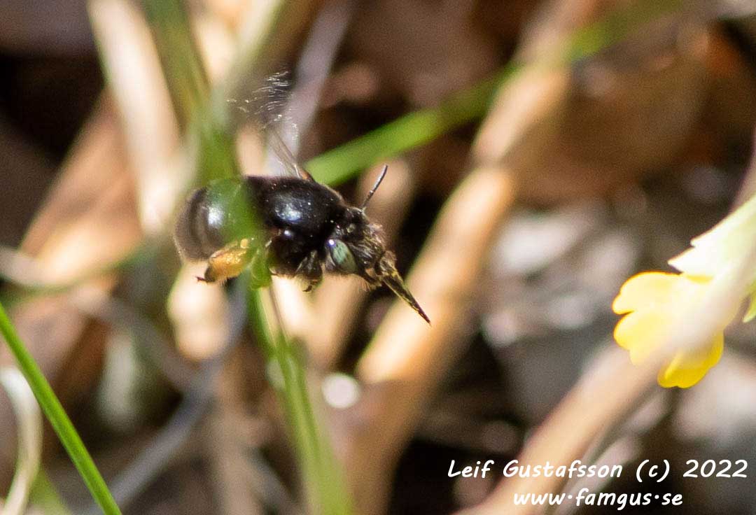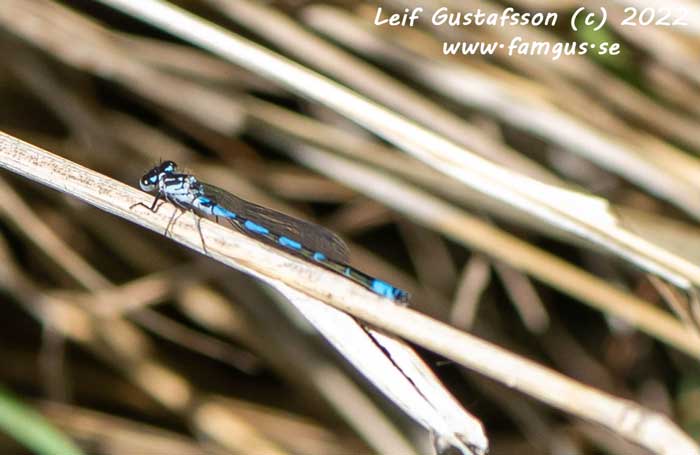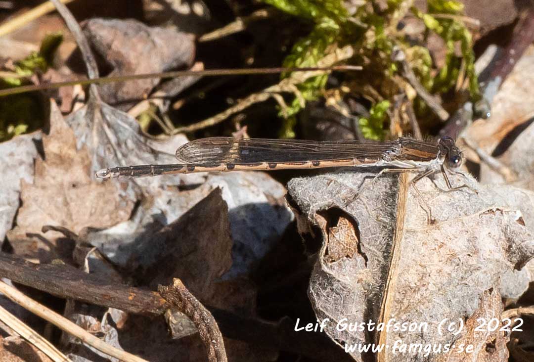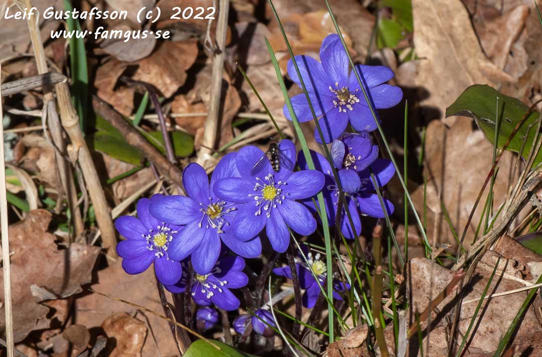 Den börjar en bit in på vägen som leder upp till ett antal hus ovanför "vassområdet". Vi hae aldrig gått den förr, även om vi många gånger gåendes på spången pratat om alla fågelröster vi hörde från skogsbacken. Nu gick vi här, bland en enorm mängd blåsippor, några vitsippor och vårlök. En fantastisk promenad, blev en del fågelobservationer också. Årets första Trädkrypare kunde noteras. Fram kom vi där spången slutade, vid "Ljugarbänken" närmare bestämt. Vi stannade en stund och spanade. På väg därifrån såg vi ett flertal Vinterflicksländor, även parningar sågs.